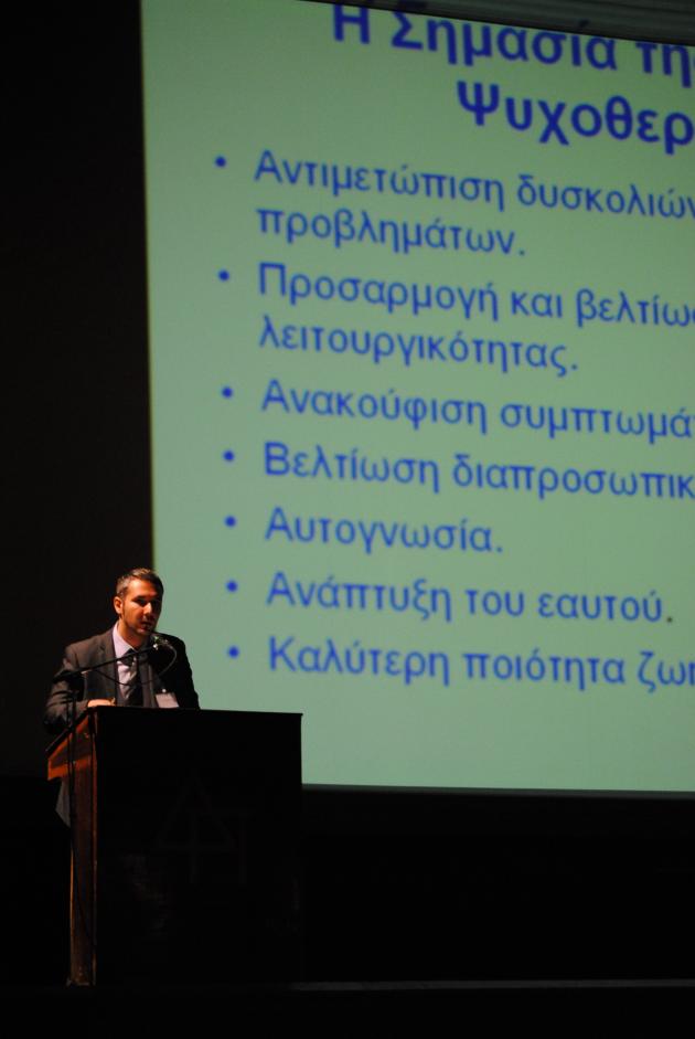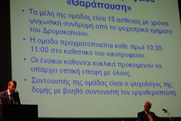 Έλαβα μέρος σε αυτήν, μιλώντας για τη "Συμβολή της Ομαδικής Ψυχοθεραπείας στην Ψυχοκοινωνική Επανένταξη". Στο πρώτο μέρος της ομιλίας έγινε μία συνοπτική παρουσίαση της σημασίας που έχει η ομαδική ψυχοθεραπεία για τον άνθρωπο. Στο δεύτερο μέρος αναλύθηκε η καθημερινή ομάδα ψυχοθεραπείας του Οικοτροφείου "Θαράπαυση" και παρουσιάστηκαν στοιχεία και αποτελέσματα από τη συμμετοχή των ενοίκων του οικοτροφείου σε αυτή.